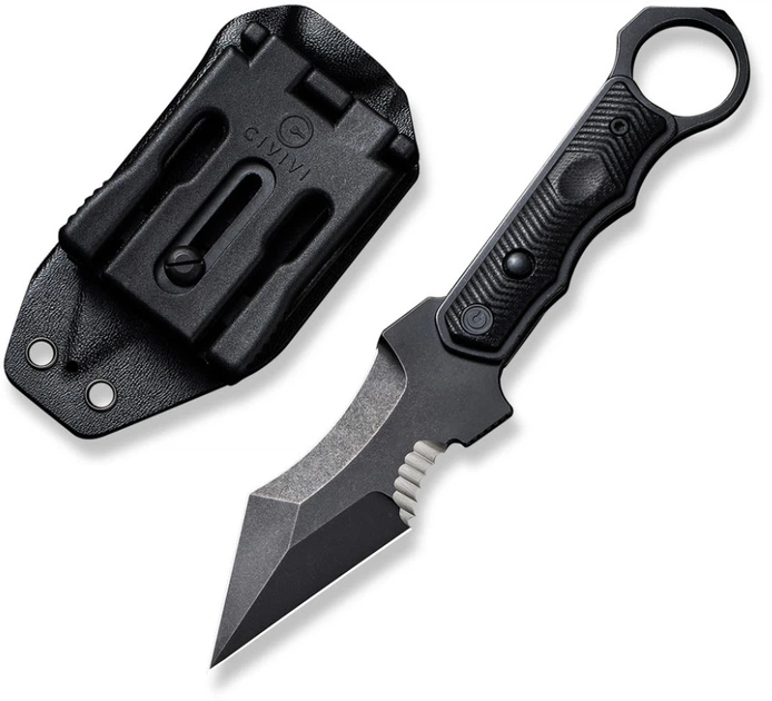 Тактический нож от Civivi предполагает установку клинка в одном из двух положений на выбор: в классическом прямом или под наклоном порядка 45° в стиле керамбит. Наклон лезвия с последующей фиксацией осуществляется нажатием кнопки. Данное решение в сочетании с необычной формой конструкции, продуманной до мелочей бывшим морским пехотинцем Тони Сентманатом (Tony Sentmanat), привело инструмент к победе на международной выставке ножей Blade Show 2022 в номинации «Самый инновационный дизайн». В производстве клинка применена сталь Nitro-V твердостью 58-60 HRC.
