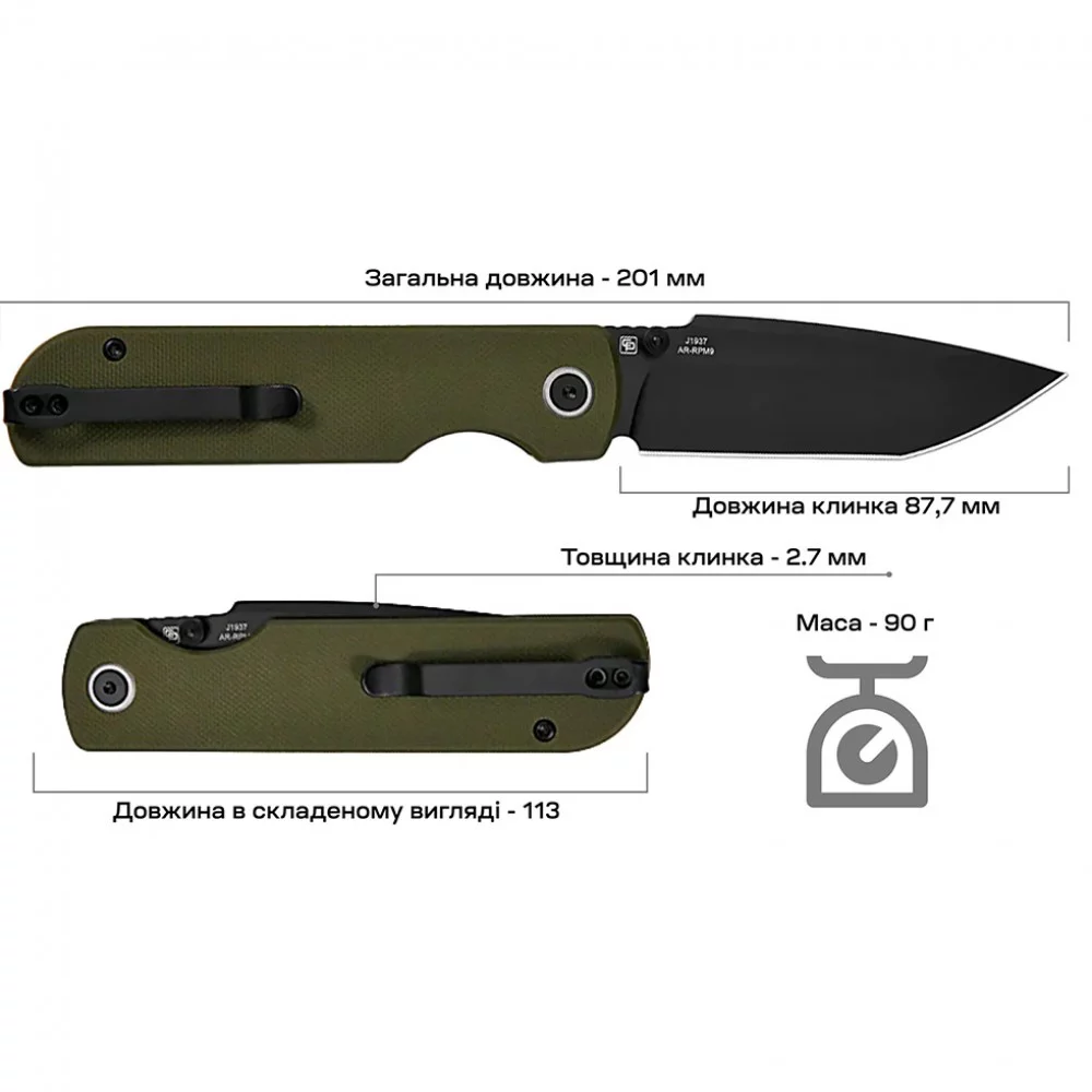 - Характеристики Габариты, Цвет, ВесОбщая длина201 ммТолщина клинка2.7 ммДлина клинка88 ммВес90 гЦветЗелёныйКлассификацияТипВидМатериалыМатериал рукоятиМатериал клинкаAR-RPM9Общие характеристикиТвердость клинка59-61 HRCНожны/чехолНетТип замкаLiner lockПоверхность клинкаBlack PVD CoatingПримечаниеНожи с клинком длиной до 90 мм и/или толщиной до 2.6 мм не относятся к холодному оружию в соответствии с «Методикой криминалистического исследования холодного оружия и конструктивно схожих с ним изделийГарантияГарантия: 12 месяцев