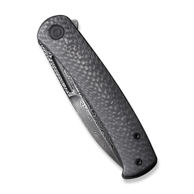 Среди положительных характеристик материала: прочность, невосприимчивость к воздействию прямых солнечных лучей, влаги, химических веществ. Края плашек закруглены, чтобы рукоять не наминала ладонь во время длительной эксплуатации ножа. Осевой винт и клипса изготовлены из нержавеющей стали и имеют черное покрытие в тон карбоновой рукояти. Клипса является однопозиционной. Полная длина модели достигает 202.9 мм, но в сложенном положении это значение уменьшается до 114.5 мм. Вес конструкции составляет 90.3 грамма.