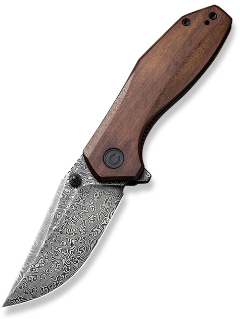 Конструкция открывается несколькими способами: при помощи стального плавника или шпенька, расположенного по обе стороны клинка. Блокирующий механизм — замок liner lock, за плавность хода отвечают керамические шарикоподшипники. Рукоять ножа дополнена накладками из древесины гибуртия. Это африканское дерево семейства бобовых, которое широко используется в производстве рукоятей ножей в силу своей прочности и уникальной красоты. Края материала обработаны таким образом, чтобы они не наминали ладонь.