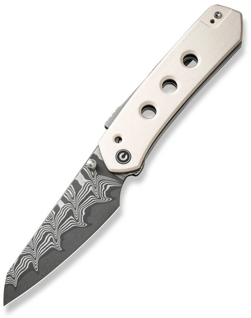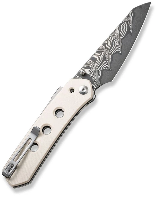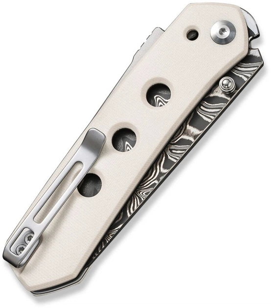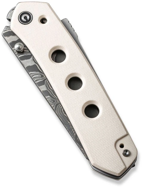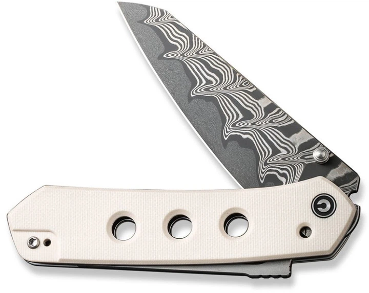 Складной нож Civivi Vision FG уникален не только внешним видом, но и конструкционными решениями, которые превращают инструмент в по-настоящему практичного и надежного помощника для решения повседневных задач. Длина клинка составляет 89.9 мм, а его толщина в обухе равна 3 мм. Клинок изготовлен из высококлассной дамасской стали жесткостью около 58-60 HRC. Металл легко справляется с резкой материалов разной плотности – от картона и пищевых продуктов до пластика и древесины. Кроме того, дамаск демонстрирует неплохую коррозионную стойкость и, конечно, имеет уникальные узоры на поверхности, которые служат уникальным украшением общего дизайна конструкции.