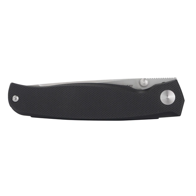 Лезвие отличается толщиной 3.5 мм, что позволяет ему эффективнее справляться с повышенными нагрузками без появления сколов. За плавное раскрытие конструкции отвечает шарикоподшипник, а за удержание лезвия в открытом виде — замок Frame Lock. Модель можно привести в боевую готовность одним взмахом руки с помощью шпенька и таким же образом закрыть ее, что позволяет ощутимо повысить комфорт эксплуатации. У основания клинка, в области обуха можно найти множественные насечки. Они выполняют функцию упора под палец, если нужно проколоть твердый предмет или выполнить инструментом особо тяжелую работу.