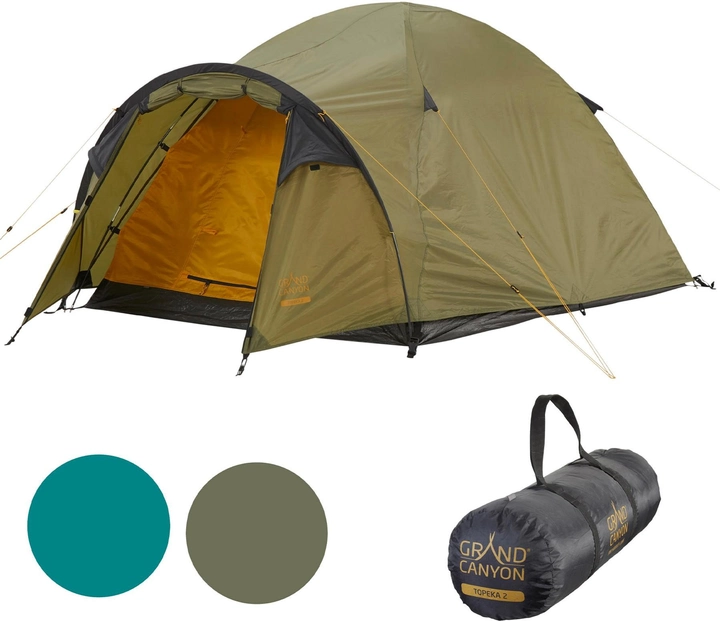 Двухслойная конструкция, полиуретановая пропитка наружного слоя и проклеенные швы обеспечивают водостойкость 4000 мм водяного столба, что позволяет не бояться проникновения влаги даже во время затяжных осадков. Вместе с тем внутренняя палатка может быть установлена отдельно от тента, что достаточно практически в летние жаркие ночи. Оливковый цвет обеспечивает отличные маскировочные свойства. Grand Canyon Topeka 2 является одной из самых высоких и широких среди двухместных палаток, при этом весит чуть более 3 кг, что делает её идеальной для и кемпинга и для пешего туризма.