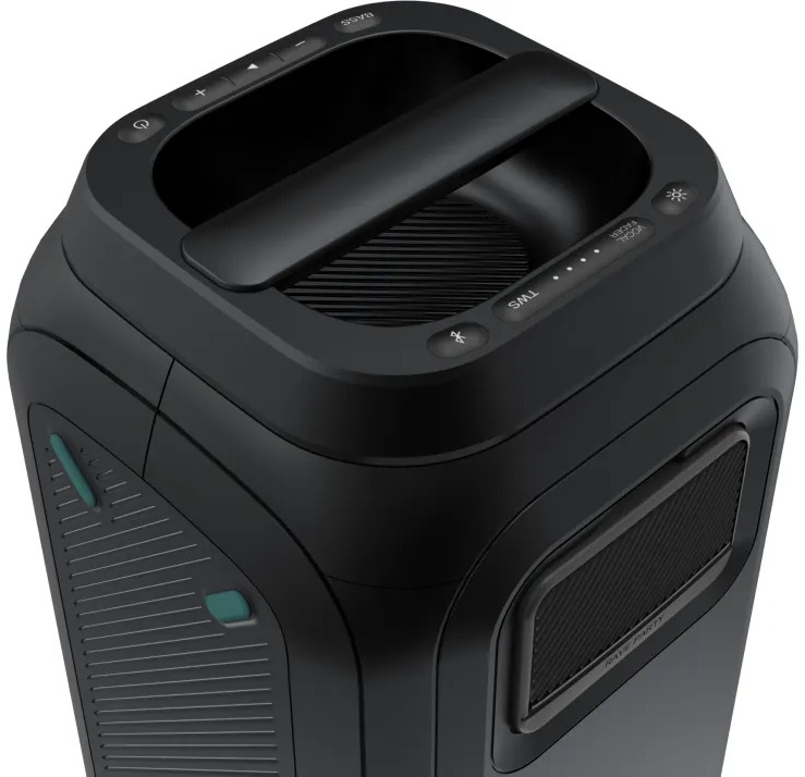 -       Описание      Портативная колонка-пати-система с мощностью до 160 Вт и конфигурацией 2.0-канала. Поддерживает Bluetooth 5.0, есть встроенный аккумулятор (~5100 мА·ч) до 12 часов работы. Присутствуют режим караоке, световые эффекты (≈5 режимов), режим TWS (параллельное соединение двух колонок). Размеры примерно 187×189×375 мм, вес около 5,3-6,3 кг. Степень защиты воды IPX4. - * Характеристики и комплектация товара могут изменяться производителем без уведомления.