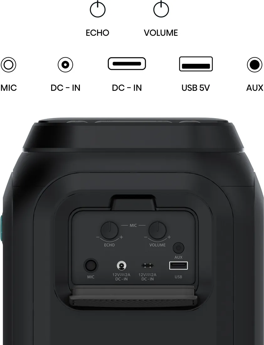 -       Характеристики      Габариты, Цвет, ВесШирина186 ммВысота374 ммГлубина185 ммЦветЧерныйОбщие характеристикиГарантияГарантия: 12 месяцевПодключениеБеспроводноеОснащениеПодсветкаВыходная мощность160 ВтФормат акустикиПитаниеПитаниеАвтономность12 чМатериалыМатериал корпусаИнтерфейсыИнтерфейсы- * Характеристики и комплектация товара могут изменяться производителем без уведомления.