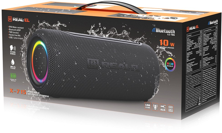 REAL-EL X-715 – это 10 Вт мощного стереозвука, до 10 метров действия Bluetooth, до 10 часов автономной работы, удобная зарядка через USB Type-C и всего 750 г веса. Создана, чтобы звучать с тобой повсюду.