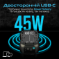 - Двусторонний 45W USB-C порт: Поддерживает технологию Power Delivery. Работает на вход и выход в режимах: 5V/3A, 9V/3A, 12V/3A, 15V/3A, 20V/2.25A.