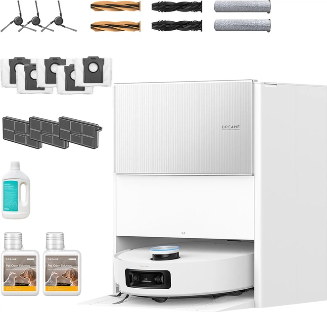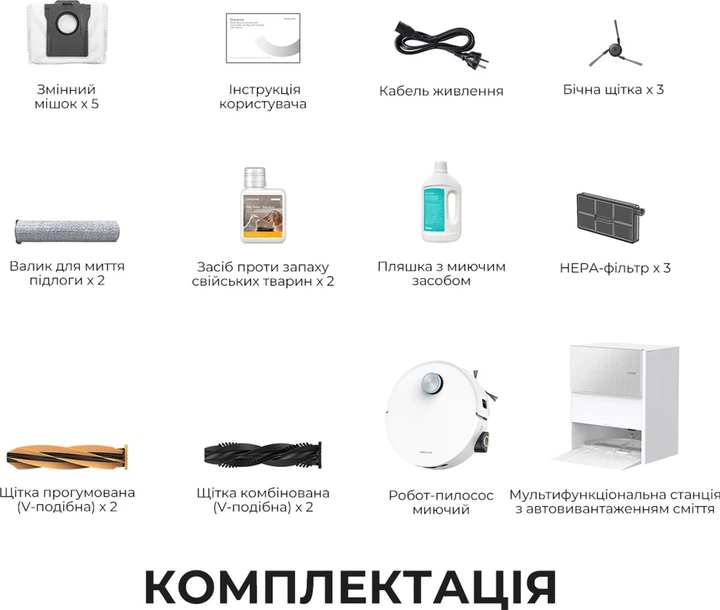 Средство против запаха домашних животных х 2 , Бутылка с моющим средством х 3 , Сменный мешок х 4 , Вращающийся модуль для мойки пола х 6 , Мультифункциональная станция с автовыгрузкой мусора , Щетка прорезиненная (V-образная) , Щетка комбинированная (V-образная) , Удлинительная пластина рампы , HEPA-фильтр , Боковая щетка , Робот-пылесос , Кабель питания , Пылесборник , Инструкция