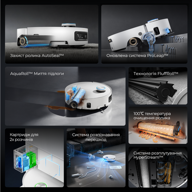 Робот-пылесос оснащен выдвижной ногой и специальным рычагом перед каждым ведущим колесом для преодоления одноуровневых ступенек высотой до 5 см и двухуровневых ступенек высотой до 8 см. Перед преодолением препятствий бинокулярный датчик определяет их высоту и выбирает оптимальную стратегию. Во время преодоления препятствия нижние датчики ToF измеряют расстояние поднятого робота над препятствиями и землей для безопасного спуска и подъёма.