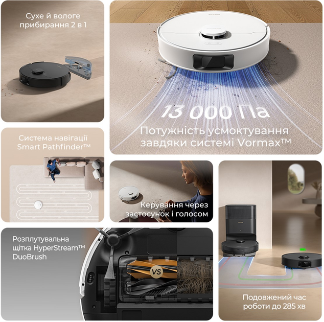 Мощность всасывания 13000 Па позволяет освежать полы и ковры, не оставляя никаких шансов крошкам, мелкому мусору или шерсти домашних животных. D20 скользит от твердых полов до ковров, эффективно справляясь с трудновыводимыми загрязнениями и мусором, застрявшим в углах.