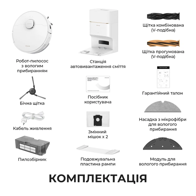 Щетка прорезиненная (V-образная) , Щетка комбинированная (V-образная) , Удлинительная пластина рампы , Насадка из микрофибры для влажной уборки , Модуль для влажной уборки , Станция автовыгрузки мусора , Боковая щетка , Робот-пылесос , Мешки для пыли , Кабель питания , Пылесборник , Инструкция