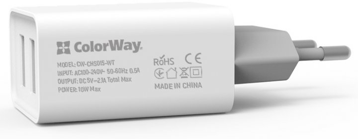 Сетевое зарядное устройство ColorWay 2 USB AUTO ID 2.1A (10W) (CW-CHS015-WT) White