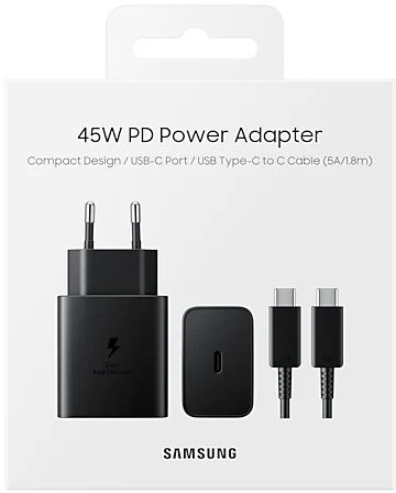 Заряжайте ваши новые устройства Galaxy максимально быстро, используя зарядное устройство мощностью 45 Вт. В комплекте также предусмотрен кабель USB Type-C - USB Type-C, который поддерживает аналогичную скорость зарядки.