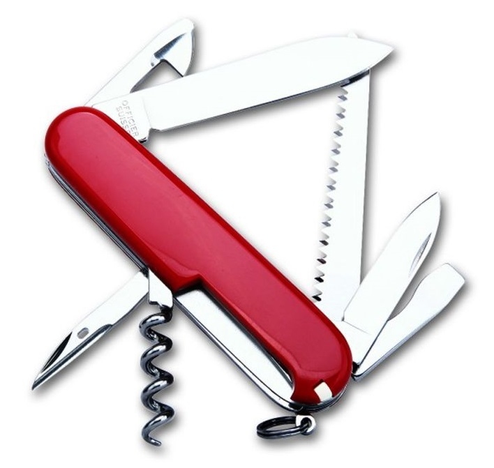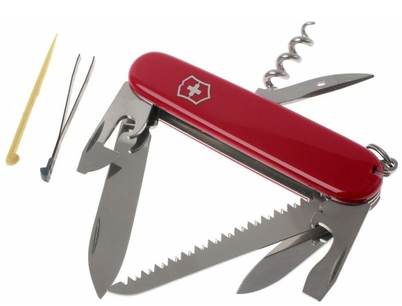 Складной многофункциональный нож от Victorinox. Рукоять красного цвета с пластиковыми накладками.