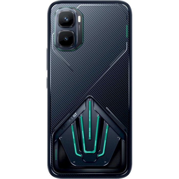 Infinix GT 50 Pro имеет агрессивный геймерский стиль с подсветкой и эргономичным корпусом, который подчёркивает его игровую направленность.