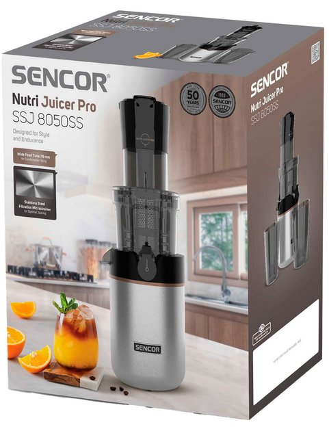 -       Описание      Соковыжималка центробежная Sencor SSJ8050SS - Современный дизайн с корпусом из нержавеющей стали