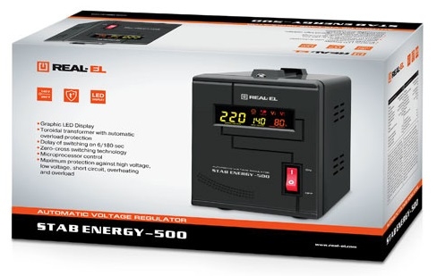 Стабилизатор напряжения REAL-EL STAB Energy-500 предназначен для обеспечения качественным и стабильным электропитанием разных потребителей в условиях больших по значению и длительности отклонений напряжения электрической сети от номинального, защите устройств-потребителей от перегрузки, от воздействия высокочастотных и импульсных помех. Графический LED дисплей
