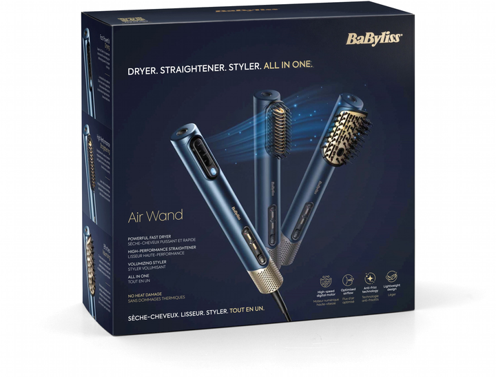 Стайлер 3 в 1 Air Wand – это универсальное устройство, сочетающее функции фена, фен-щетки и выпрямителя, позволяя создавать разнообразные прически. Благодаря мощности 1600 Вт и цифровому мотору, стайлер обеспечивает быструю и эффективную укладку волос. Устройство оснащено режимом "холодный воздух", двойной функцией ионизации для уменьшения статического электричества и 3 скоростями и 3 температурными режимами для индивидуальной настройки.