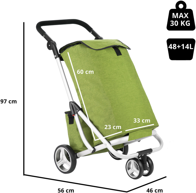 Сумка-тележка ShoppingCruiser 3 Wheels Green (650071) воплощает в себе легкость, прочность, стойкость, компактность. Трехколесная система обеспечивает стабильность и маневренность, а также возможность везти тележку впереди вас. Конструкцией шасси предусмотрено трехточечную опору колес, благодаря чему сумка-тележка устойчива и может служить пользователю дополнительной опорой при передвижении. Передняя пара колес имеет возможность независимого разворота на 360°, что позволяет легко маневрировать при движении.