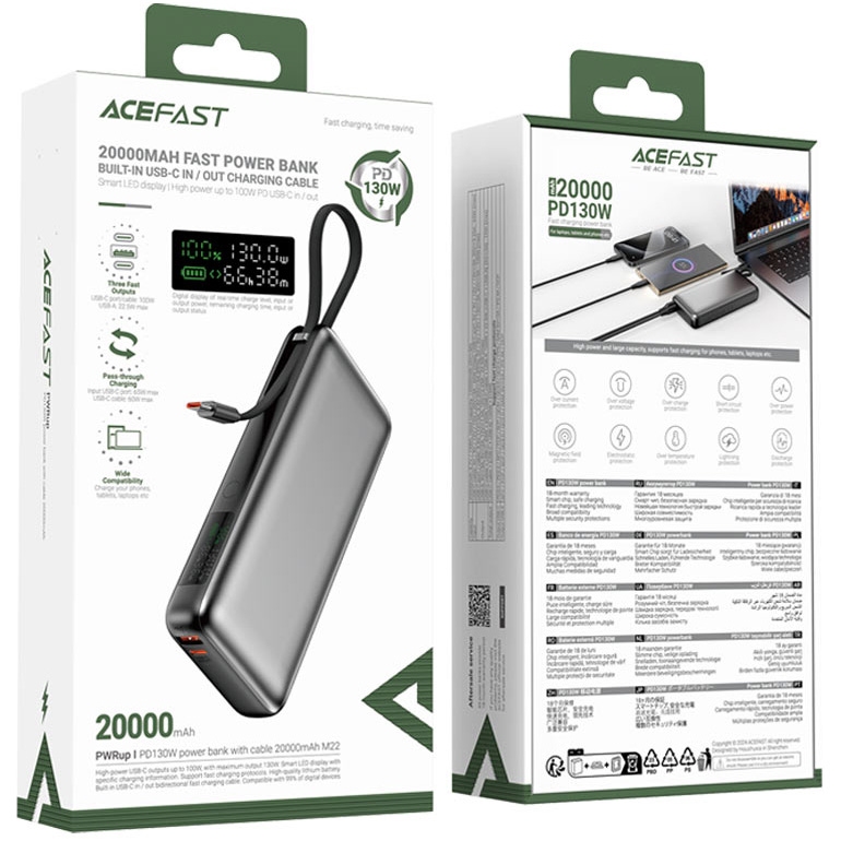 Универсальная мобильная батарея Acefast M22 с емкостью 20000 мАч обеспечивает быструю и безопасную зарядку современных гаджетов. Общая выходная мощность составляет 130 Вт, что позволяет эффективно подпитывать как смартфоны, так и планшеты или ноутбуки. Поддержка популярных протоколов быстрой зарядки PPS, PD3.0, PD2.0, QC4+, QC3.0, QC2.0, AFC, FCP, SCP делает устройство совместимым с большинством техники.