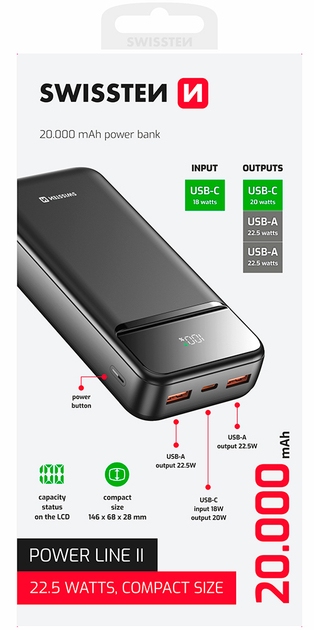 - Описание Повербанк SWISSTEN Power Bank 20000 mAh Power Line II Black