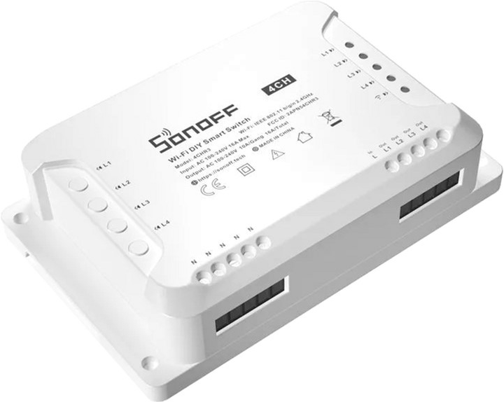 4-канальные интеллектуальные коммутаторы Wi-Fi, разработанные, чтобы дать вам возможность интегрировать интеллектуальное управление в ваш дом, для создания умного дома. Умный выключатель имеет 4 группы, которые можно использовать для управления освещением и другой бытовой техникой одновременно в четырех областях вашего дома. Улучшение 4CHPROR3 заключается в том, что пользователи могут устанавливать 3 режима работы (самоблокировку, блокировку и толчковый режим) в приложении eWeLink без открытия корпуса оборудования, что упрощает работу. Таким образом, вы можете включить режим самоблокировки для включения / выключения 4 подключенных устройств по отдельности, режим блокировки для включения 1 подключенного устройства каждый раз и одновременного выключения остальных устройств и инчинг-режим, чтобы включить 1 подключенное устройство, а затем заставить его автоматически выключить через заданное время (0,5 - 3600 с). Устройство можно монтировать на стандартной унифицированной DIN - рейке. Устройство поддерживает голосовое управление и совместимость с Alexa и умным помощником Google Home.