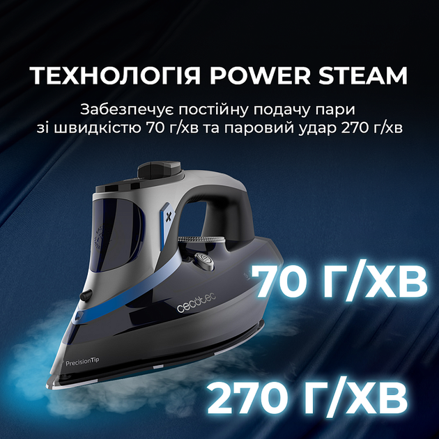 Технология Power Steam обеспечивает постоянную подачу пара со скоростью до 55 г/мин и мощную подачу пара со скоростью 200 г/мин, что позволяет разглаживать даже самые стойкие складки, проникая в самую сердцевину ткани.