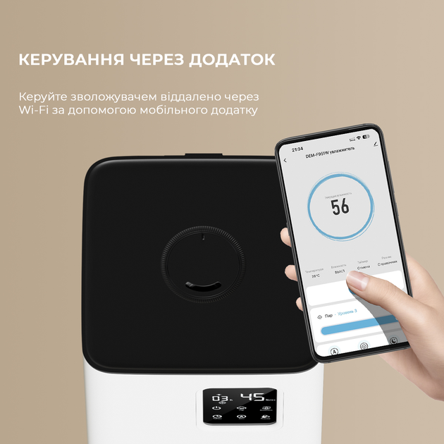 Бак объемом 4.8 л позволяет увлажнителю работать длительное время без необходимости частой доливки воды. Устройство оснащено интеллектуальным цифровым дисплеем, на котором постоянно отображаются такие ключевые параметры, как температура, влажность и режим увлажнения.