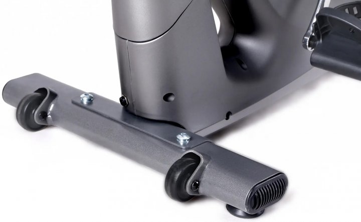 Сиденье велотренажера регулируется по высоте и в горизонтальной плоскости для индивидуальной настройки, а транспортировочные ролики в передней части тренажера позволяют перемещать его по комнате.