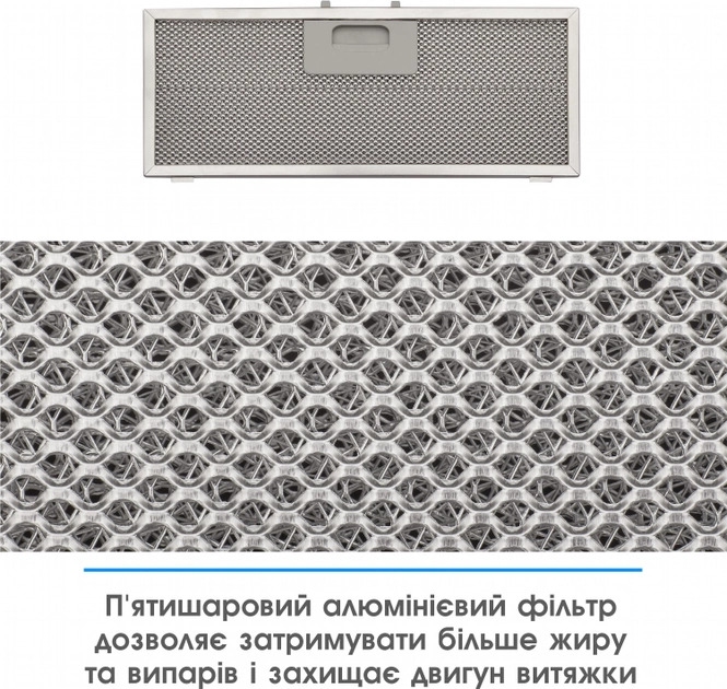Прочный 5-слойный алюминиевый фильтр поглощает жир, грязь, мелкие посторонние частицы и защищает двигатель капота. Для удобства очистки достаточно снять его и помыть в горячей воде или посудомоечной машине.Дополнительный режим – разряд или рециркуляция