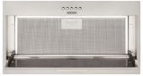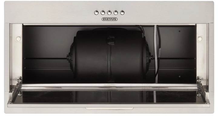Вытяжка полностью встраивается в обычный кухонный шкафчик шириной 60 см. Видимой остается только передняя панель из нержавеющей стали, устойчивая к влаге и высоким температурам. Лаконичный дизайн вытяжки гармонично сочетается с кухней и в стиле минимализм, хай-тек или модерн.