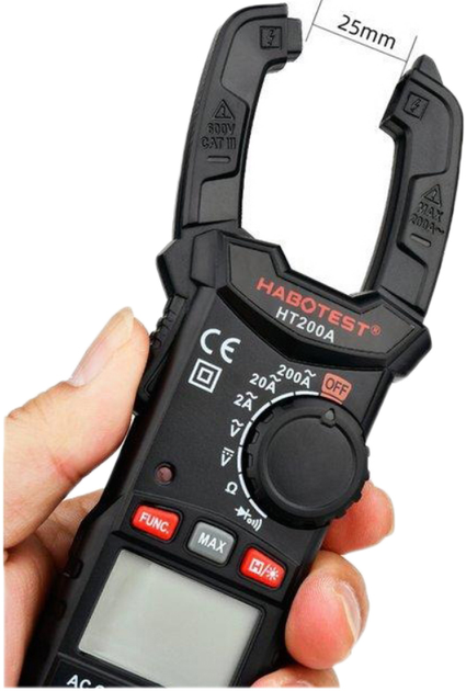 Зажимной измеритель HABOTEST AC600В/200A, DC600В позволяет измерять: переменный ток, постоянное напряжение, переменное напряжение, сопротивление, диоды и тесты на целостность цепи. Зажимной измеритель предназначен для бесконтактного измерения тока. С подсветкой дисплея, предупреждением о низком заряде батареи. Автоматическое отключение для экономии заряда батареи. Дисплей на 2000 отсчетов. Небольшой, легкий инструмент, эргономичной формы, удобно держать в руке. Поставляется с измерительными проводами. Батареи в комплект не входят.