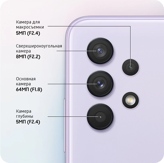 Samsung Galaxy A32 отримав 4-модульну основну камеру. Вона включає в себе головний 64-мегапіксельний датчик з апертурою f/1.8. Також цей телефон оснащений 8-мегапіксельним ультраширококутним датчиком з апертурою f/2.2. Крім цього, смартфон отримав 5-мегапіксельну макрокамеру (f/2.4) і 5-мегапіксельний датчик глибини (f/2.4). Крім того, в додатку «Камера» присутні такі режими зйомки як PRO, нічний режим, макрозйомка, портрет та ін. Варто сказати, що основна камера цього пристрою здатна записувати відео в FullHD якості.