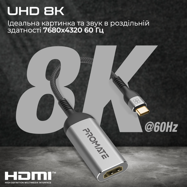 З MediaLink-8K від Promate ти зможеш підключити ноутбук, планшет або смартфон з портом USB-C до телевізору або проектору з підтримкою HDMI. Адаптер підтримує роздільну здатність 8К з частотою 60 Гц, забезпечує приголомшливу чіткість картинки та звуку при перегляді відео в UHD якості.
