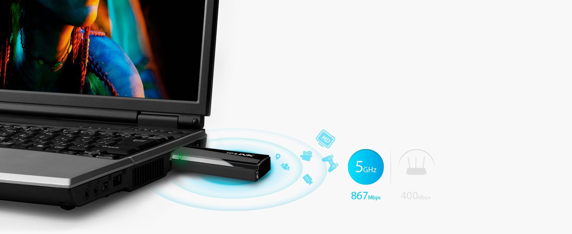 Використання частоти 5 ГГц на швидкості до 867 Мбіт/с відмінно підходить для потокової передачі HD-відео та онлайн ігор, в той час як частота 2,4 ГГц (швидкість до 300 Мбіт/с) може використовуватися для перегляду веб-сторінок в Інтернеті. Для поліпшеної продуктивності рекомендується використовувати Archer T4U в парі з маршрутизатором серії 11ac.