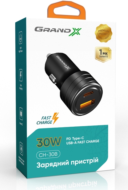 Автомобільний зарядний пристрій Grand-X CH-30B USB + TypeC 30W PD QС3.0 Black