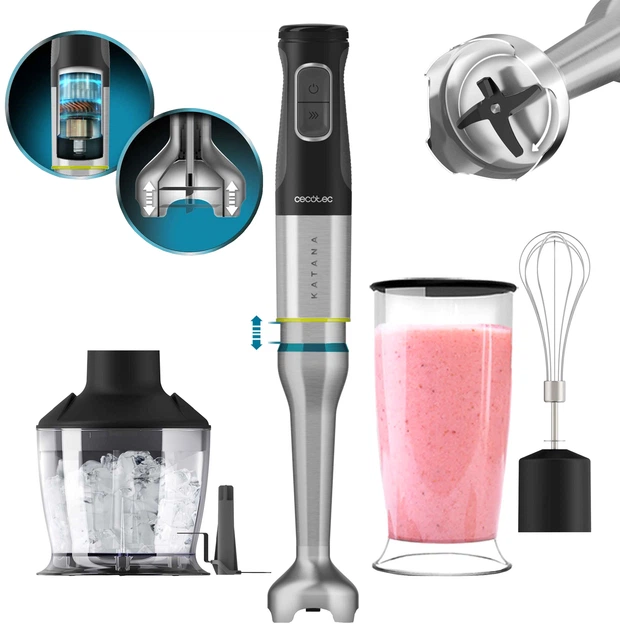 - Опис Сучасний і потужний занурювальний блендер CECOTEC Katana 15 створений для швидкого і ідеального збивання, подрібнення і змішування найрізноманітніших інгредієнтів. Завдяки високопродуктивному двигуну і міцним лезам з чорним титановим покриттям він легко справляється навіть з щільними продуктами, забезпечуючи однорідну текстуру і зберігаючи природний смак ваших страв.Висока ефективністьЗмішуйте будь-які інгредієнти без особливих зусиль завдяки мотору потужністю до 1500 Вт, який дозволяє швидко досягти ідеальної текстури ваших страв.Технологія Perreo MoveЛегко досягайте потрібної текстури завдяки руху лез вгору і вниз, що підвищує ефективність різання і запобігає розбризкуванню під час роботи.Максимальна потужністьВиберіть потрібну Вам швидкість роботи, яка найкраще підходить для кожного рецепта, щоб досягти ідеального результату. А якщо вам потрібна додаткова потужність, використовуйте функцію «Турбо» і подрібнюйте без зусиль.Ідеальна текстураПодрібнюйте продукти і досягайте ідеального результату під час приготування будь-яких ваших страв за найкоротший проміжок часу.Безмежні можливостіПодрібніть, наріжте, змішайте, зберіть і досягайте ідеальних результатів у кожному приготуванні найзручнішим способом за допомогою досить великого асортименту насадок.Робоча поверхня завжди чистаКонструкція кришки поруч з ніжкою XL запобігає потраплянню бризок для максимально комфортного подрібнення, при цьому Ваш стіл завжди буде чистим.Леза з титановим покриттямПодрібнюйте практично будь-які продукти за допомогою 4 лез з чорним титановим покриттям, які відрізняються підвищеною зносостійкістю і поліпшеною гостротою. Така конструкція дозволяє приготувати ідеально однорідний смузі за мінімальний час.