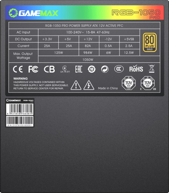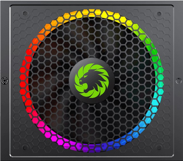 Повністю модульний вентилятор GameMax RGB-1050 PRO із сертифікацією 80+ Gold, 140-мм вентилятор ARGB підтримує синхронізацію із сумісними материнськими платами з RGB-підсвітками від ASUS, GIGABYTE, MSI та ASRock Режим освітлення RGB: 25 інтелектуальних режимів освітлення RGB з функцією пам'яті, Повний модульний Надтихий вентилятор Чудові конденсатори забезпечують стабільність, довговічність та надійність, включно з електричним захистом OPP/OVP/UVP/SCP/OCP.