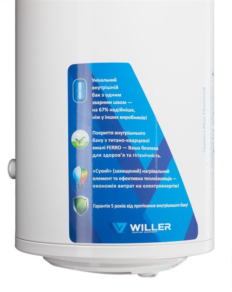 Водонагрівач Willer EV80DR Optima DHE - надійний агрегат з сухими тенами та унікальною технологією з'єднання бака за допомогою плазмового зварювання. За результатами численних випробувань, одношовний бак знизив випадки протікання на 67%. Дубльовані нагрівальні елементи сумарною потужністю 2000 Вт (2 x 1000 Вт) забезпечують стійкість системи. У разі виходу з ладу одного з нагрівачів, нагрів води триватиме завдяки баку, що залишився. Терморегулятор подвійної дії автоматично відключає пристрій при температурі, яку встановив власник або при досягненні аварійного значення температури води. Розміщення нагрівальних елементів всередині емальованого кожуха збільшує ресурс, полегшує технічне обслуговування, підвищує ефективність та безпеку.