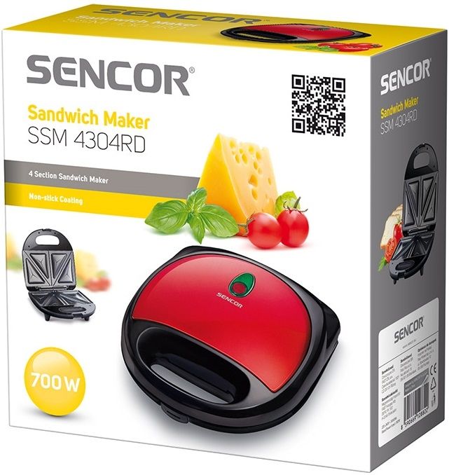 Модель Sencor SSM 4304 має спеціальне антипригарне покриття пластин, яке легко піддається чищенню і запобігає пригорання бутербродів. За рахунок системи захисту прилад надійно захищений від перегріву, що гарантує тривалий термін служби. Нековзні ніжки забезпечують стійкість на робочому столі. Корпус виготовлений з міцного червоного пластику.