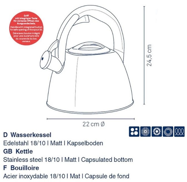 Практична деталь при зверненні: в ручку вбудовано кнопку для безпечного відкриття кришки, щоб при розливі окропу ви не стикалися з гарячою парою. Чайник Vitus з нержавіючої сталі 18/10, об'єм 2,4 л, з високоякісним універсальним дном, підходить також для індукційних плит.