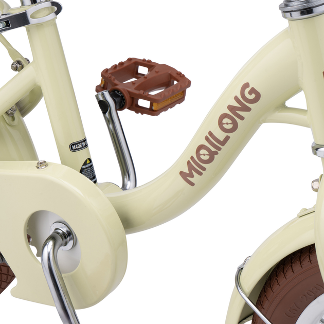Оберіть Miqilong для якісного та безпечного катання вашої дитини. Рама велосипеда стальна і має достатню міцність, щоб витримати всі навантаження пов'язані з навчанням дитини катанню на велосипеді. Рама виконана за класичною схемою міського велосипеда з високим кермом. Така конструкція забезпечує зручне сідання та дозволяє дитині їздити на велосипеді з рівною поставою, не вигинаючись і не горблячись. Додатково на рамі закріплений металевий багажник над заднім колесом.