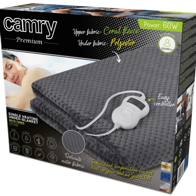 Електрична ковдра Camry забезпечує тепло та комфорт, що розслабляють. Рекомендується для людей, які піклуються про своє здоров'я. Електрична ковдра заспокоює невралгії, допомагає розслабити м'язи та покращує кровообіг. Рекомендується під час лікування симптомів артриту та ревматизму.