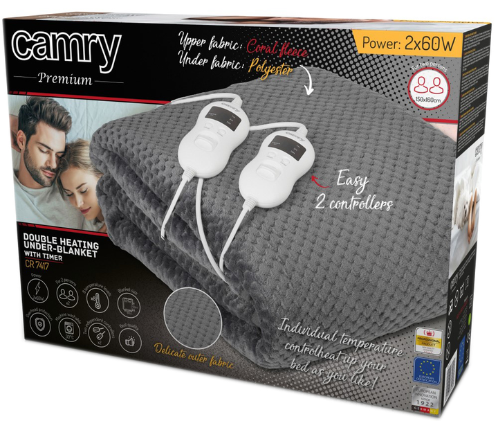 Електрична ковдра Camry забезпечує тепло та комфорт, що розслабляють. Рекомендується для людей, які піклуються про своє здоров'я. Електрична ковдра заспокоює невралгії, допомагає розслабити м'язи та покращує кровообіг. Рекомендується під час лікування симптомів артриту та ревматизму.