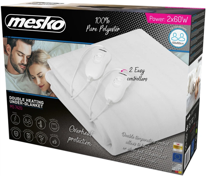 Електрична ковдра Mesko забезпечує тепло і комфорт для відпочинку. Вона також рекомендована для людей, які піклуються про своє здоров'я. Вона знімає невралгію, заспокоює м'язову скутість і покращує кровообіг. Також полегшує ревматичні захворювання. Ковдра забезпечує швидкий і рівномірний розподіл тепла, дозволяючи насолоджуватися теплою постіллю вже через кілька хвилин після включення. Ковдра виготовлена з м'якого та приємного на дотик матеріалу. Її можна прати, від'єднавши шнур живлення та регулятор температури. Останній дозволяє вибрати рівень температури і захищає від перегріву. Модель MS 7420, з розмірами висота: 150 см та ширина: 160 см, розрахована на 2 осіб.