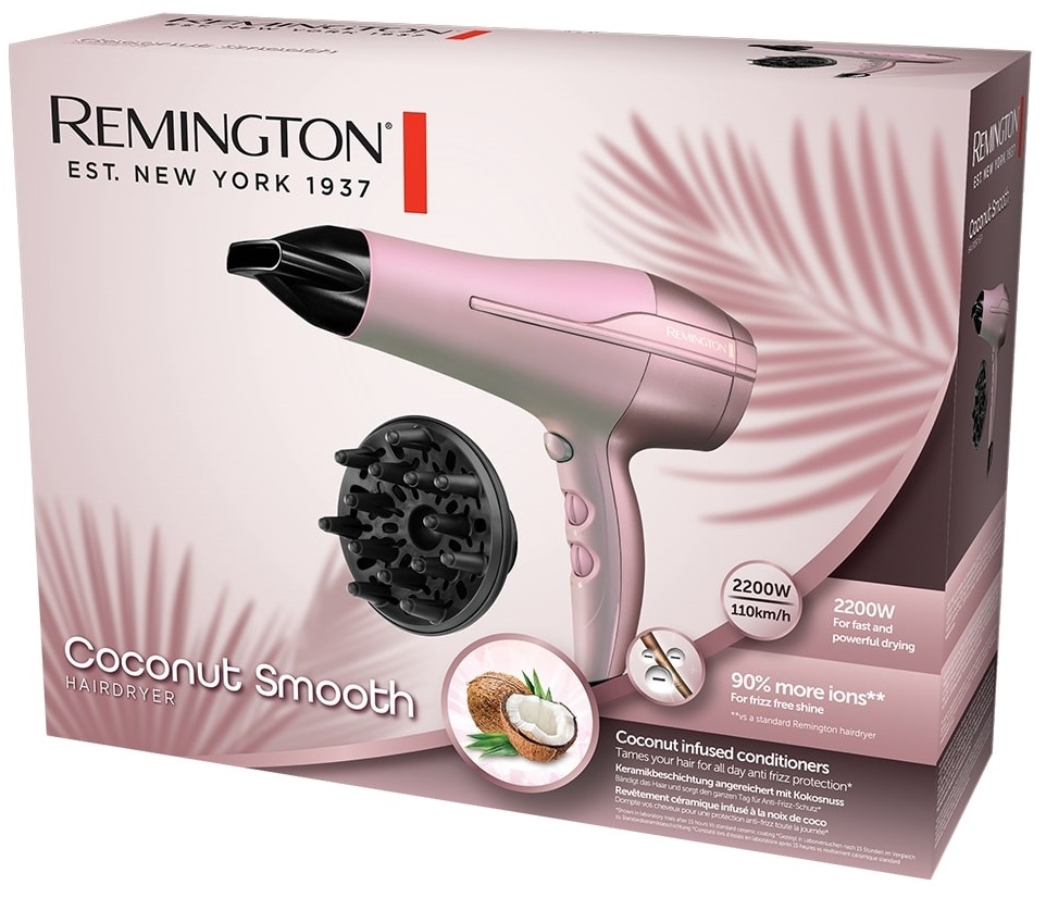 Створіть гарне укладання із захистом від сплутування волосся за допомогою фена Coconut Smooth. Удосконалене кільце, що кондиціює, з мікрокондиціонерами на основі кокосового горіха забезпечує стійкий гладкий результат укладання і захищає волосся від повсякденної вологості. Завдяки іонному кондиціювання, що містить на 90% більше іонів, і потужності 2200 Вт, ви отримаєте швидкий і потужний результат сушіння з блиском та без сплутування волосся.