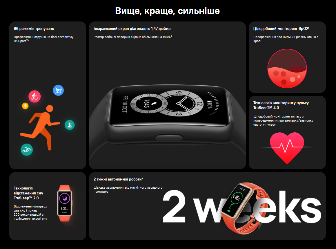 Інші моделі Huawei > - Опис Приголомшливий колірЖивіть яскраво з новим HUAWEI Band 6, доповненим м'яким силіконовим ремінцем в 4 популярних відтінках. Кожен підкреслить ваш стиль, щоб ви виглядали неперевершено в натовпі або стримано в офісі. З вагою всього 18 г цей браслет практично не відчувається на руці і створює повний комфорт завдяки своїй приємній фактурі.2 тижні активного моніторингуСтворений для життя в русі, HUAWEI Band 6 тепер працює до 2 тижнів без підзарядки. А це до 14 днів за умови звичайного використання та до 10 днів в режимі активного моніторингу. А коли потрібно буде терміново зарядити браслет, то циклу швидкої 5-хвилинної зарядки вистачить для автономної роботи ще до 2 днів. І це з новою технологією магнітної зарядки від HUAWEI, яка відкриває новий формат ергономіки.Контролює стан серцяНова технологія TruSeen™ 4.0 ще краще аналізує ритм вашого пульсу. Об'єднуючи потужні оптичні лінзи і розумні алгоритми AI, вона буде постійно контролювати серце, визначаючи ефективність тренувань і критичні навантаження в залі. При цьому ви завжди отримаєте повідомлення в момент уповільнення або прискорення пульсу, щоб було ще легше стежити за здоров'ям.Вимірює рівень кисню SpO2Слідкуйте за своїм самопочуттям 24/7, легко визначаючи навіть найменші коливання SpO2. Тепер фітнес-браслет створює вібрації на руці, коли виявляє проблеми з диханням і критичне зниження рівня кисню в крові. Так буде ще легше контролювати навантаження в залі, стежити за якістю відпочинку і самопочуттям в будь-якій ситуації.Визначає рівень стресуКеруйте своїм диханням з розумним браслетом HUAWEI Band 6, який допомагає знизити хвилювання. Розроблений на базі технології TruRelax™, він точно визначає стан стресу і дає докладні рекомендації щодо відновлення спокійного ритму. І вже через кілька хвилин дихальних вправ ви зможете заспокоїтися і розслабитися після сильного навантаження.Стежить за якістю снуВідпочивайте правильно з новою технологією TruSleep™ 2.0, створеною спеціально для HUAWEI. Вона буде ще краще визначати тривалість і всі фази сну, допомагаючи підвищити якість вашого відпочинку. Точність аналізу тепер поліпшена до 96.3%, а це значить, що HUAWEI Band 6 тепер визначає тривалість глибокого, неглибокого, швидкого і денного сну, які впливають на бадьорість протягом дня. Отримуйте кращі рекомендації щодо вироблення регулярних звичок вашого сну і зберігайте енергійність для нових відкриттів.Відстежує жіночі циклиНовий HUAWEI Band 6 тепер стежить за жіночим здоров'ям, а це значить, що ви зможете тримати все під контролем. Залишайтеся в курсі всіх періодів циклу і точно плануйте свій графік зустрічей і тренувань для кожного тижня.Мотивує до звершеньСлідкуйте за своїм прогресом за кольоровими кільцями активності, які відображають кількість кроків, тривалість навантажень і рівень фізичного навантаження протягом дня. Ставте нові цілі та наближайтеся до своєї ідеальної форми разом з HUAWEI Band 6, який завжди мотивує до більшого.Ваш персональний тренерТренуйтеся так, як ви любите, з новим браслетом HUAWEI Band 6, який підтримує 96 режимів активності. Виходьте на пробіжку, займаєтеся велоспортом, плаванням або боксом – він точно визначить ефективність будь-яких тренувань і виведе на зап'ястя тривалість вправ, кількість спалених калорій і частоту пульсу. Тепер ви зможете легко відстежити свій прогрес і ставити нов