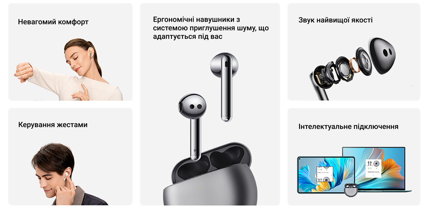 Кожне вухо індивідуально. Ось чому FreeBuds 4 використовують технологію адаптивної відповідності для визначення вашої унікальної форми і способу носіння навушників. А потім інтелектуально обирають з безлічі режимів шумозаглушення той, який необхідний для досягнення оптимального зниження низькочастотних звуків.