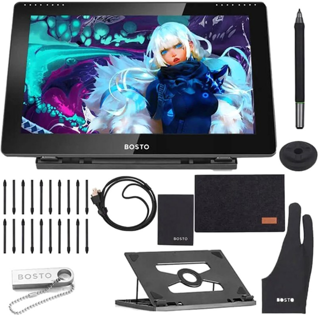 Комплектація: графічний монітор, регульована підставка, перо, 10 наконечників; тримач для ручки, кабель 2 в 1, короткий посібник користувача, серветка для протирання, рукавичка.