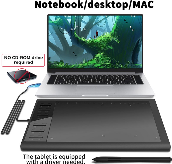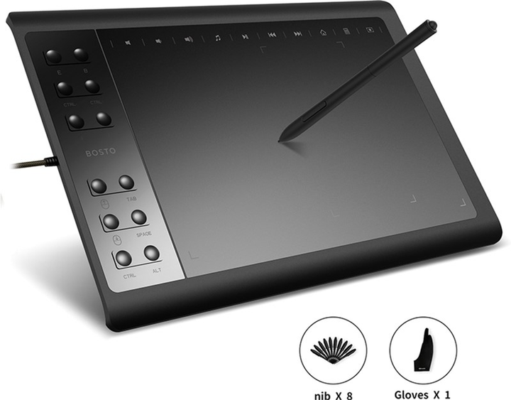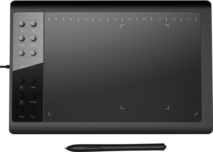 Графічний планшетBOSTO 1060є проривом у сфері графічних планшетів. Професійні характеристики, які дають користувачеві величезну свободу у творчості та роботі. Збалансований розмір планшета дозволяють брати його із собою завжди та всюди. Якщо ви любите музику, цей планшет для вас. Сенсорні 10 експрес-клавіш для керування мультимедіа. Пасивне перо (безбатарейний стілус). Пасивне перо не має батарейки і не вимагає заряджання, що дозволяє малювати не відволікаючись по дрібницях.